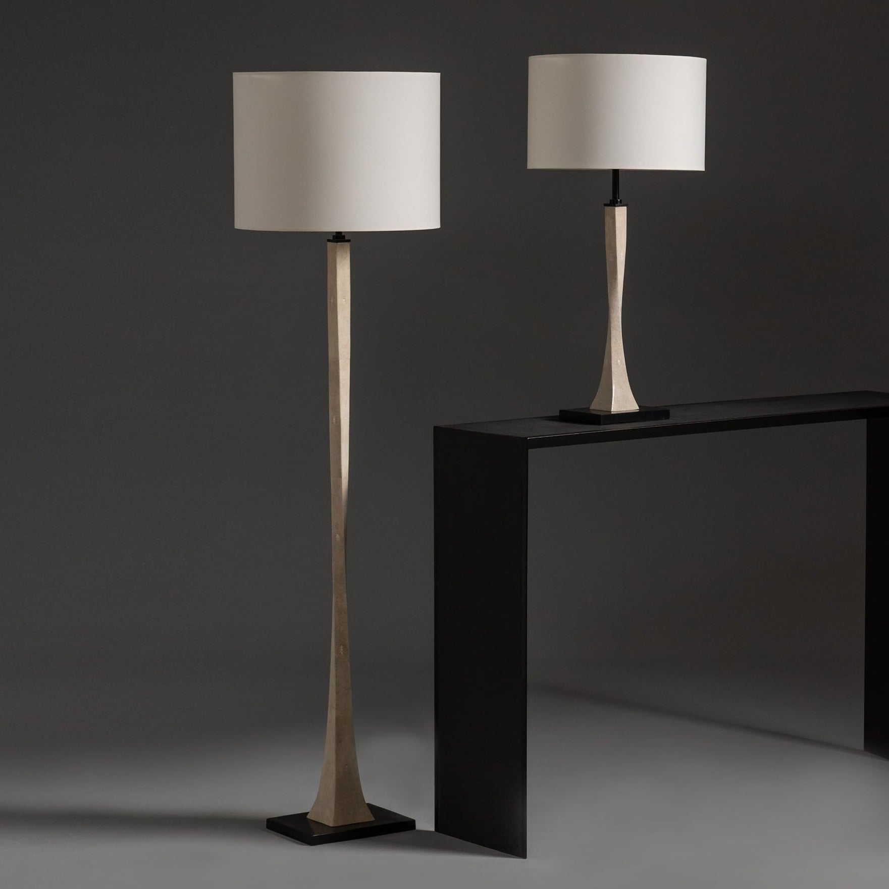 Shagreen and bronze floor lamp produced using the superior lost wax bronze casting process, hand-rubbed and finished in selected patina.